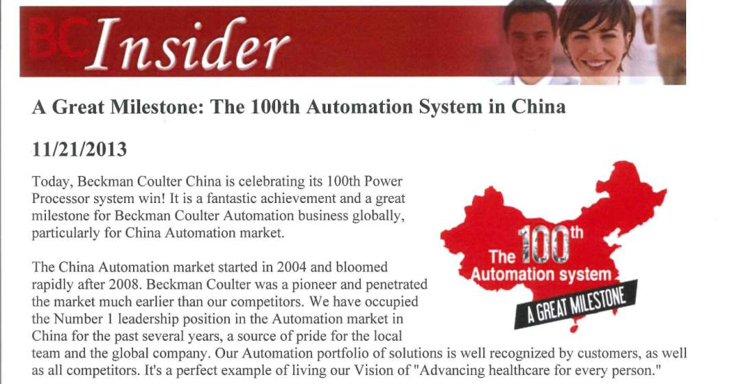 图释:引自2013年、2015年贝克曼全球内部通讯(部分):庆祝在中国安装第100套、200套自动化系统。时任贝克曼库尔特中国区高管的屈建(Hurry Qu)提出“500套”为下一目标,本土化战略持续推进。