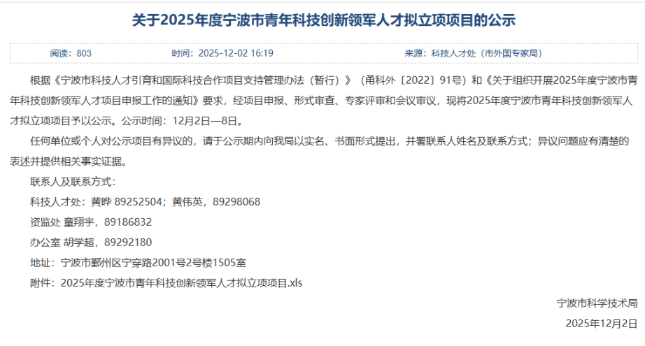 近日,宁波市科技局发布《关于2025年度宁波市青年科技创新领军人才拟立项项目的公示》,经项目申