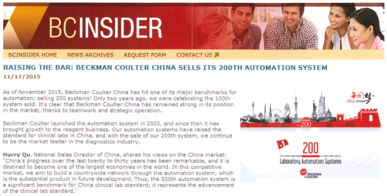 图释:引自2013年、2015年贝克曼全球内部通讯(部分):庆祝在中国安装第100套、200套自动化系统。时任贝克曼库尔特中国区高管的屈建(Hurry Qu)提出“500套”为下一目标,本土化战略持续推进。